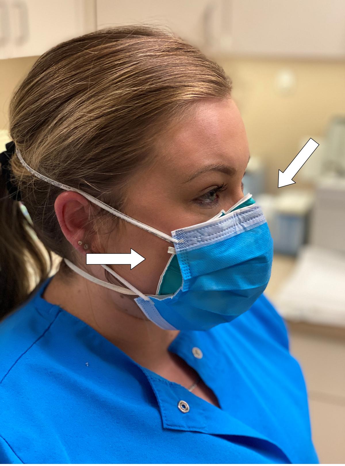Here is a basic face mask that would have been considered standard a few weeks ago. From the photo you can see they do not fit snuggly against the face and make a seal. This allows aerosols and even liquids and solids to move freely in and out from the mask to and from the patient.